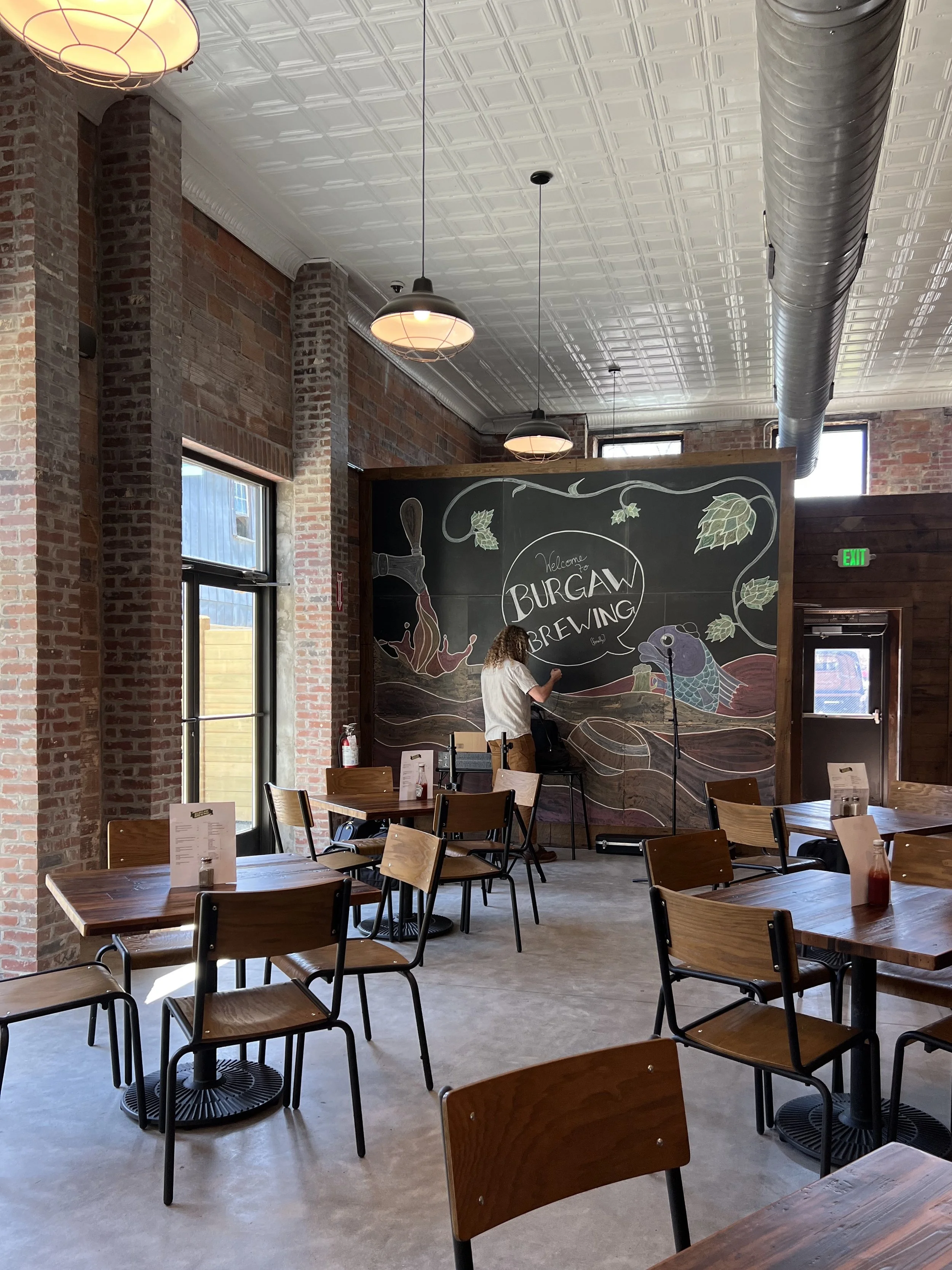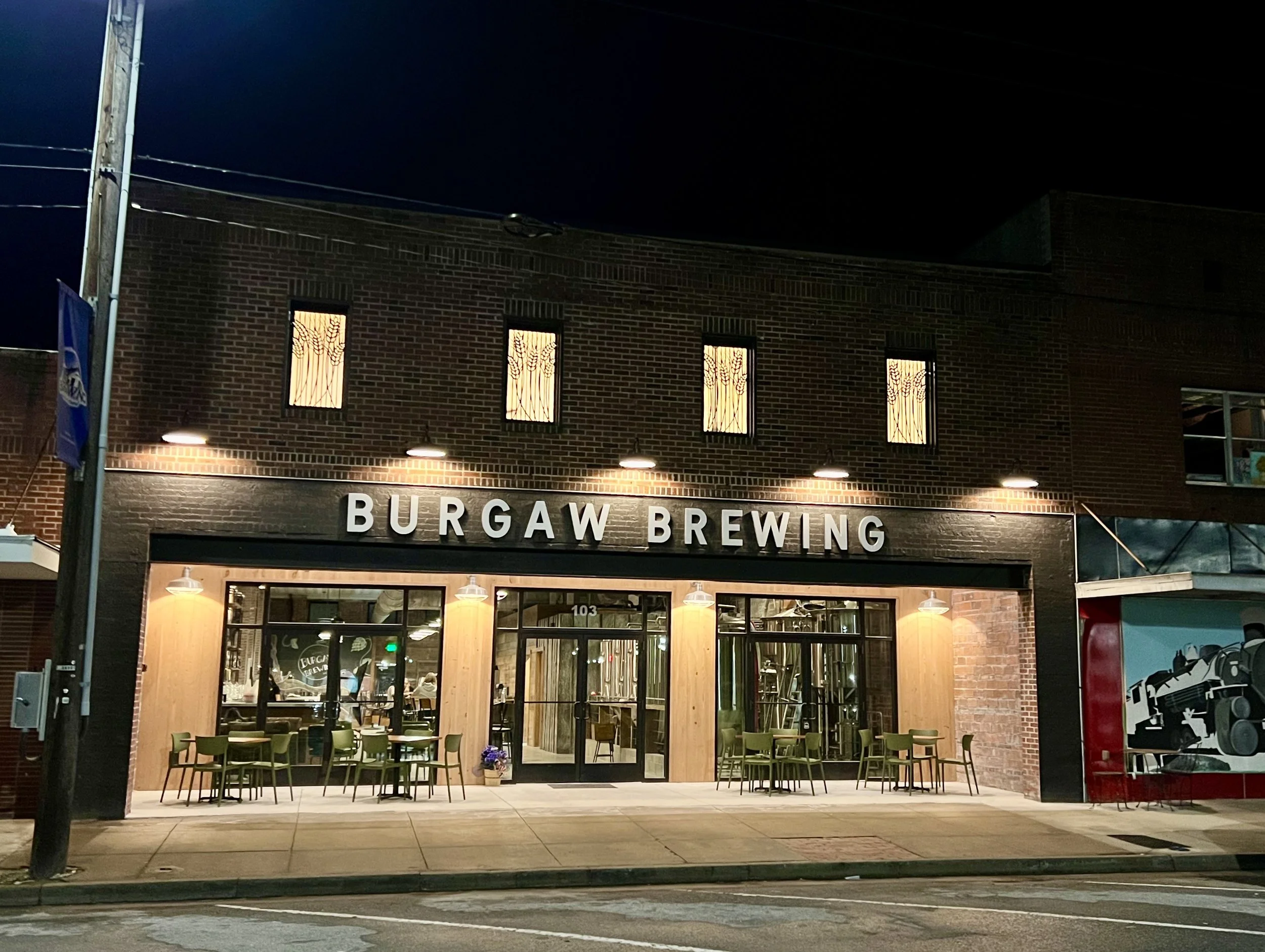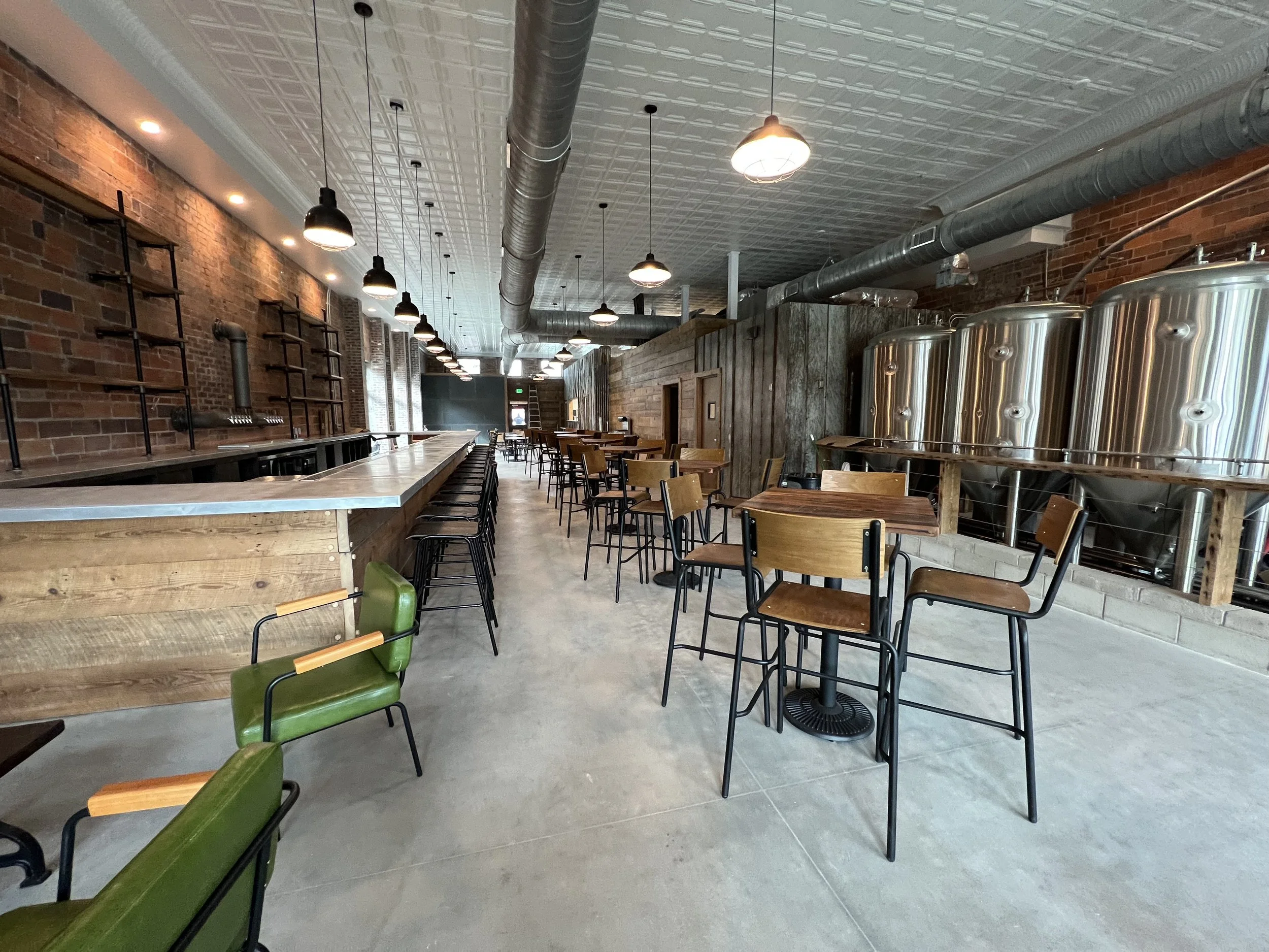 Burgaw, North Carolina brewery with interior and exterior materials and finishes, lighting, furniture, and decor by Chris Cahill Interior Design.