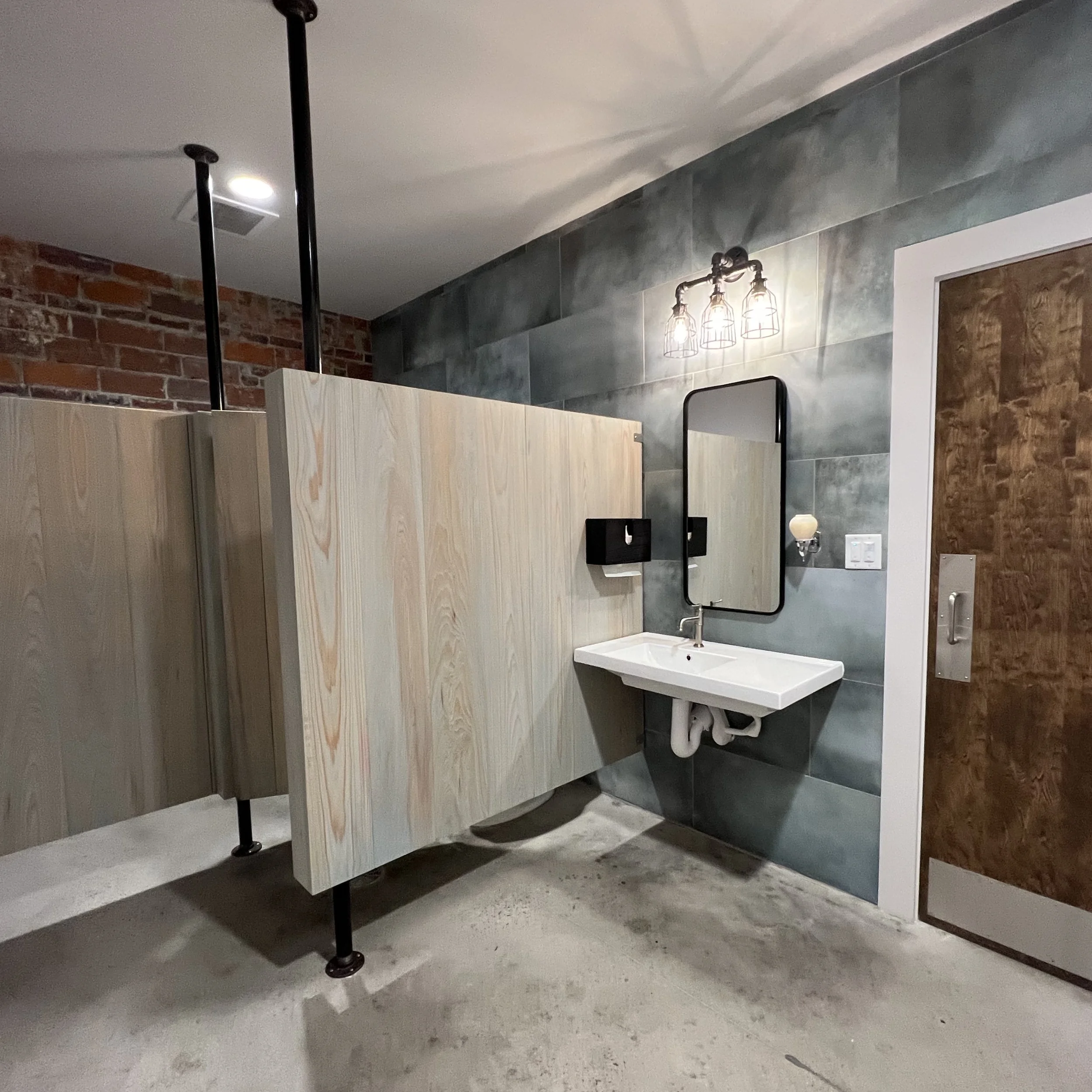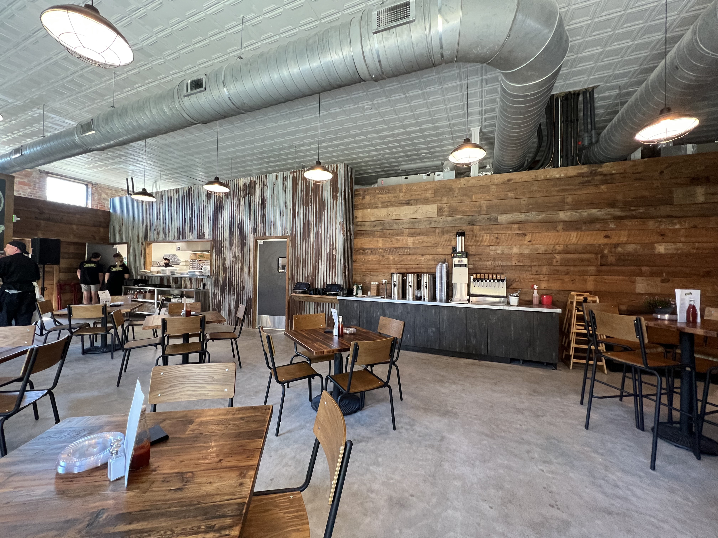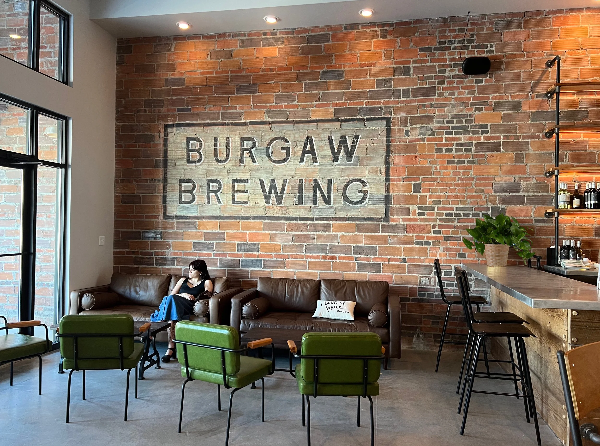 Burgaw, North Carolina brewery with interior and exterior materials and finishes, lighting, furniture, and decor by Chris Cahill Interior Design.