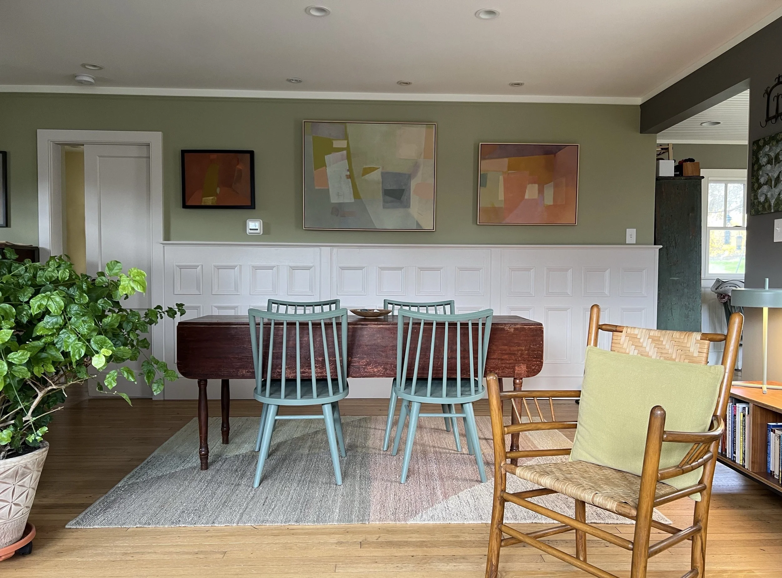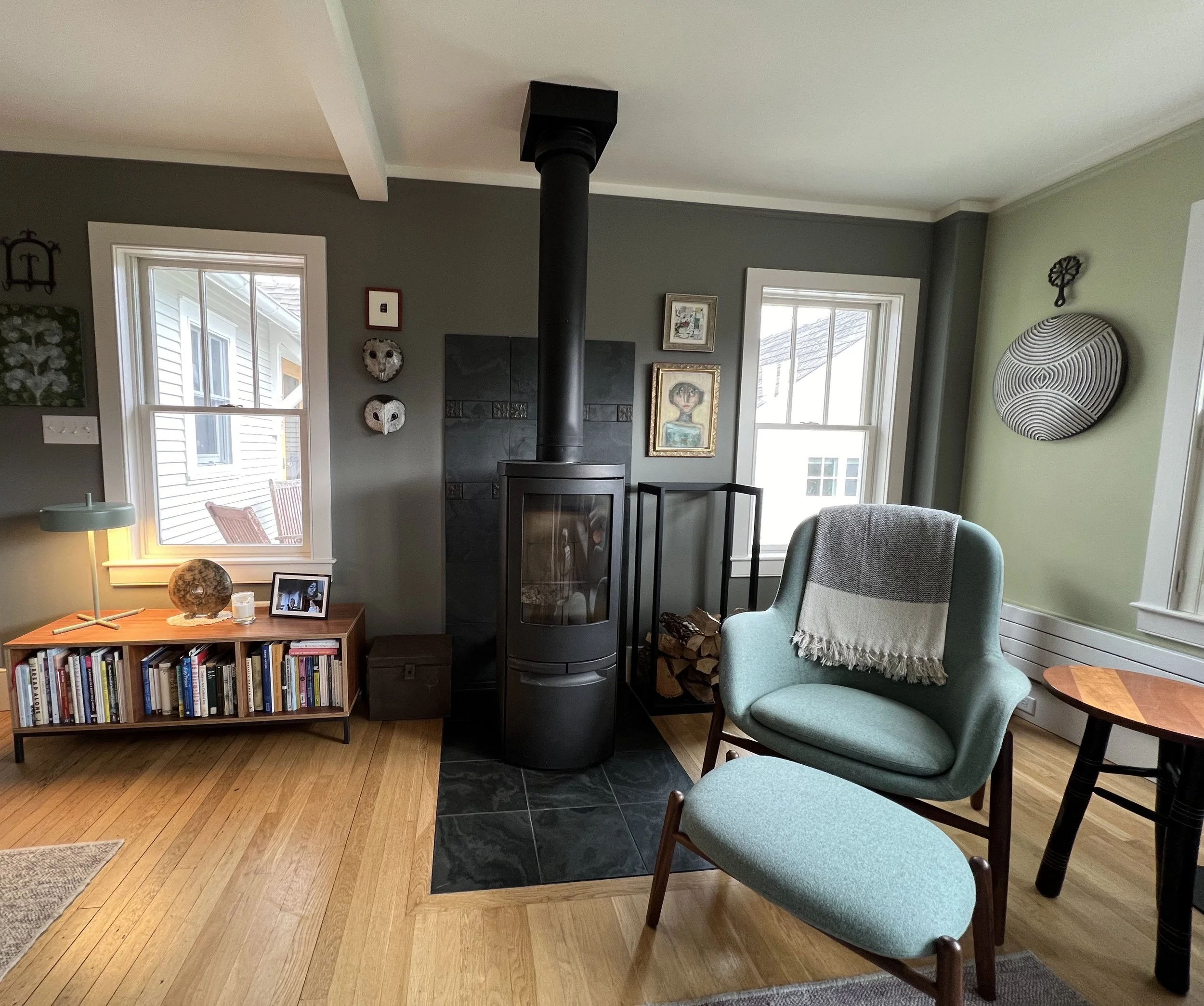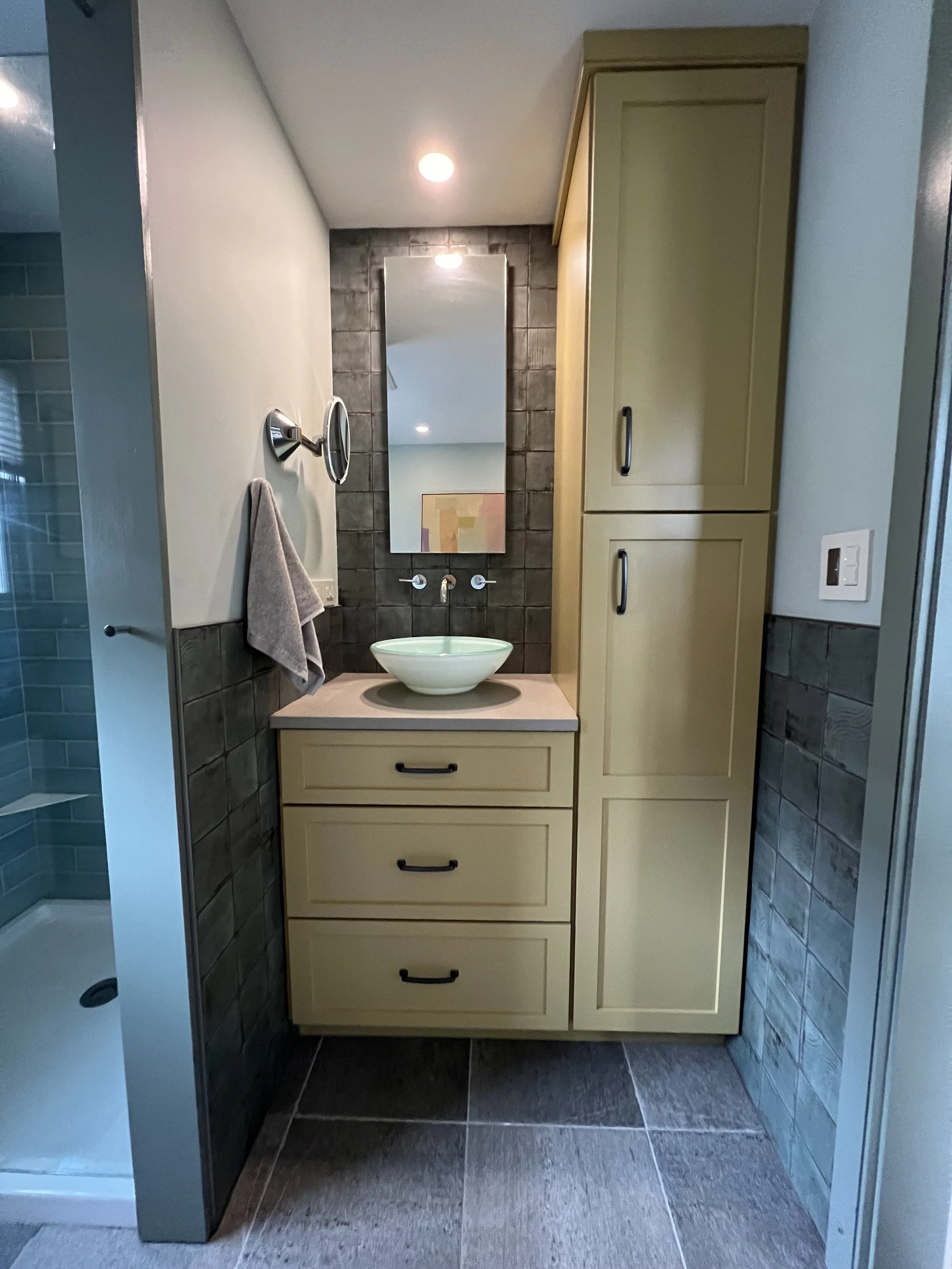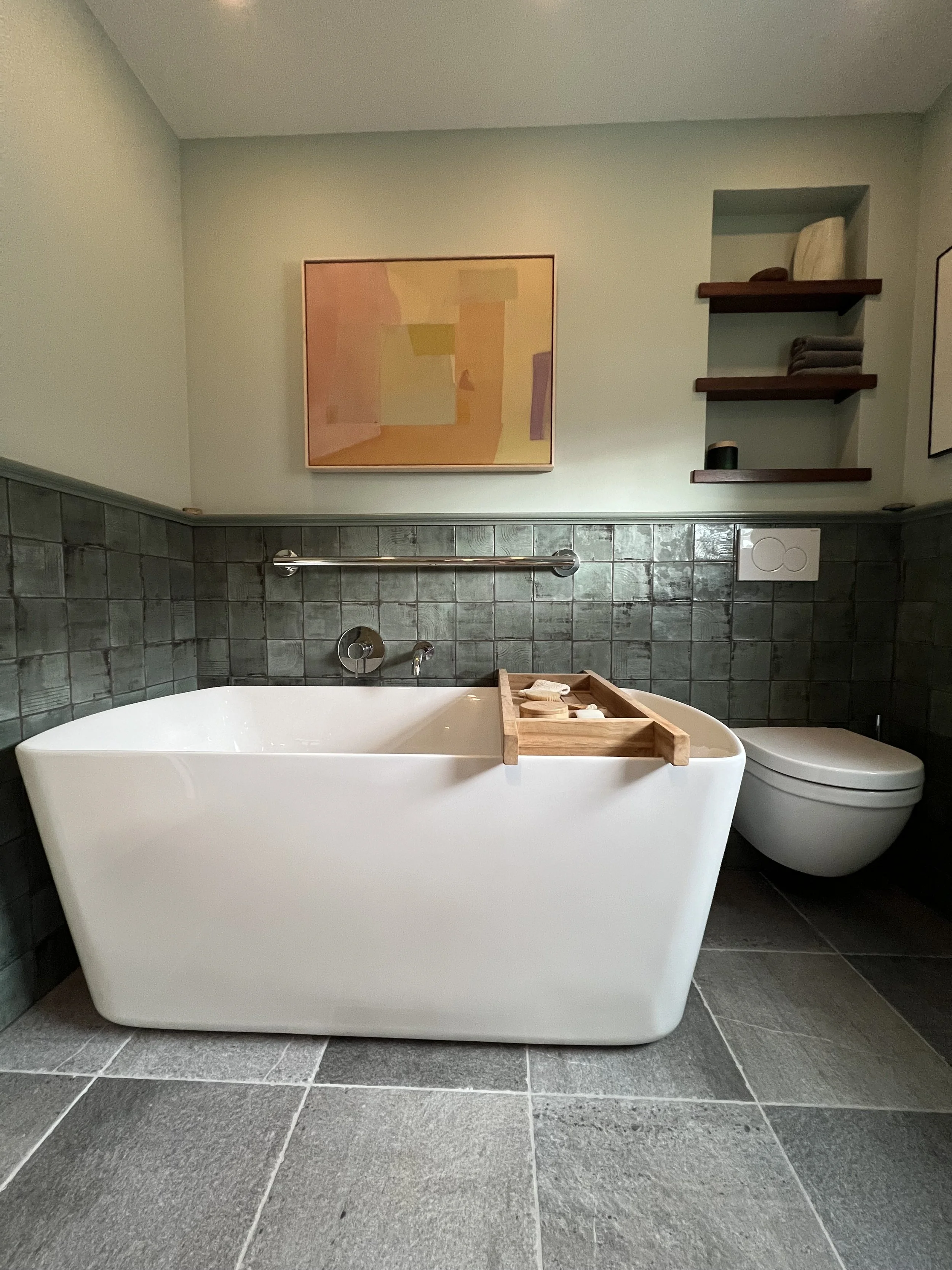 Frenchtown, New Jersey artist residence with furnishing, lighting, and bathroom design by Chris Cahill Interior Design. Bathroom design includes interior materials and finishes, plumbing fixtures, cabinetry, and accessories.