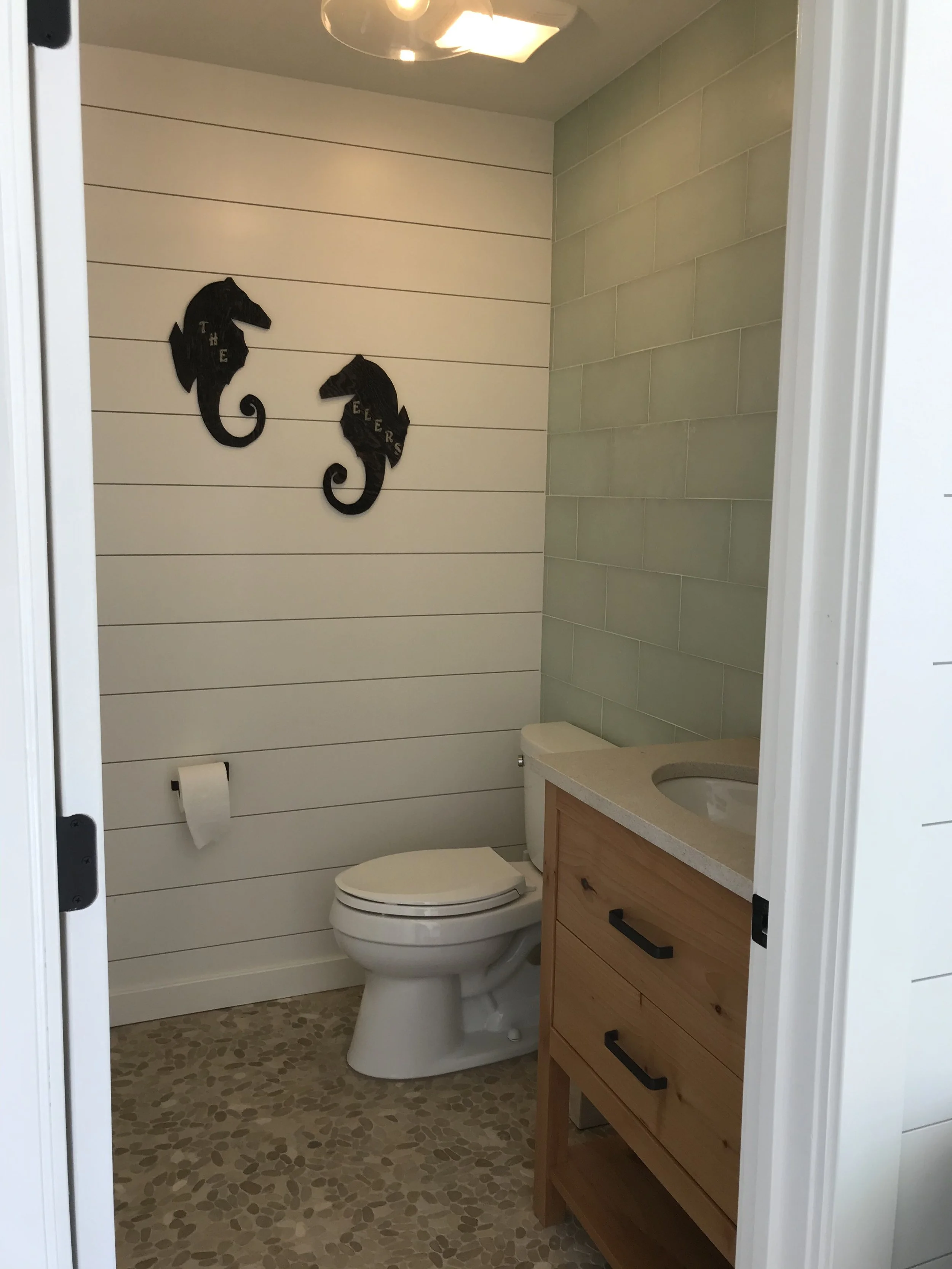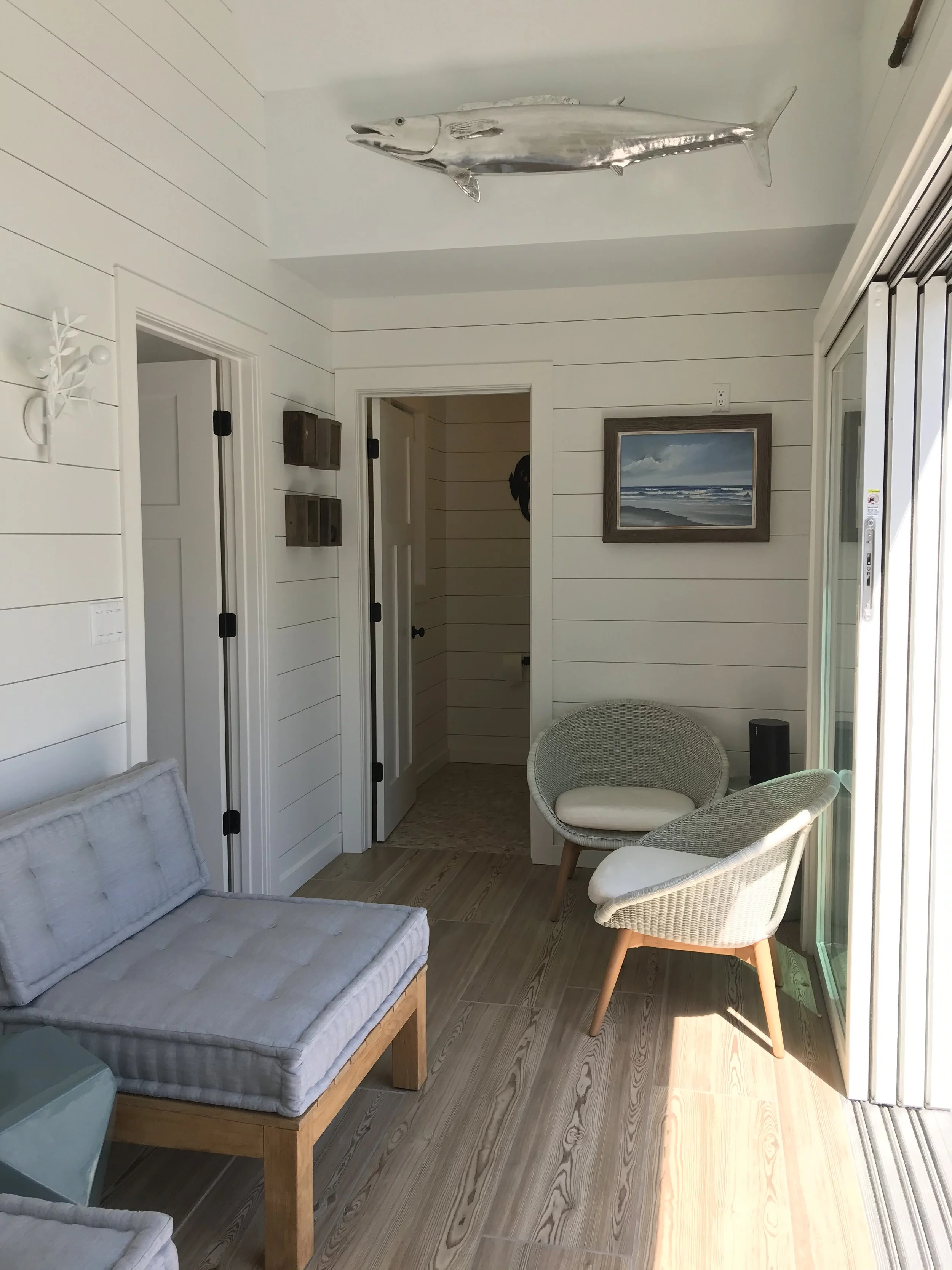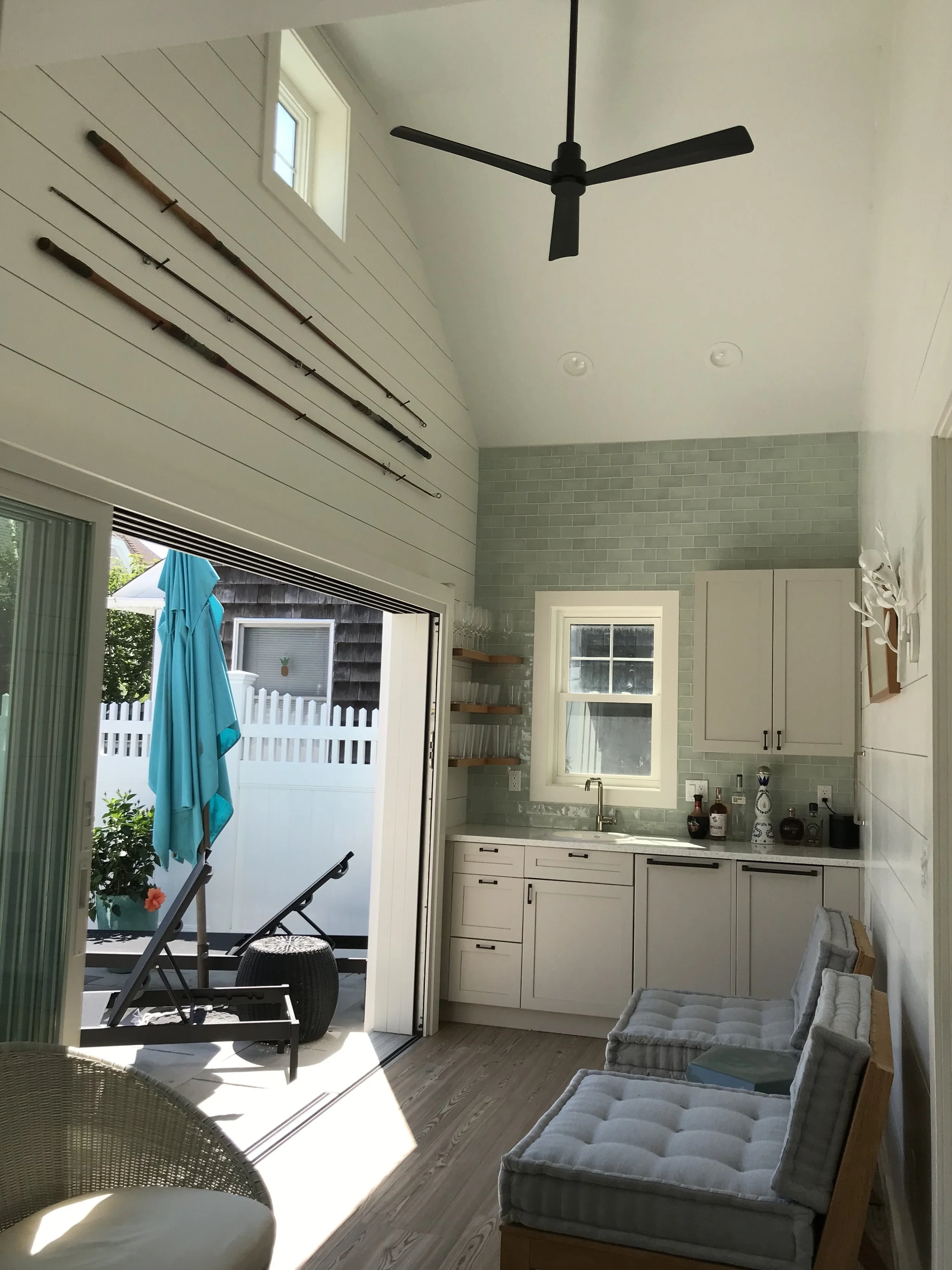 Jersey Shore cabana with kitchen and bathroom design, interior materials and finishes, lighting, plumbing fixtures, furniture and decor by Chris Cahill Interior Design.