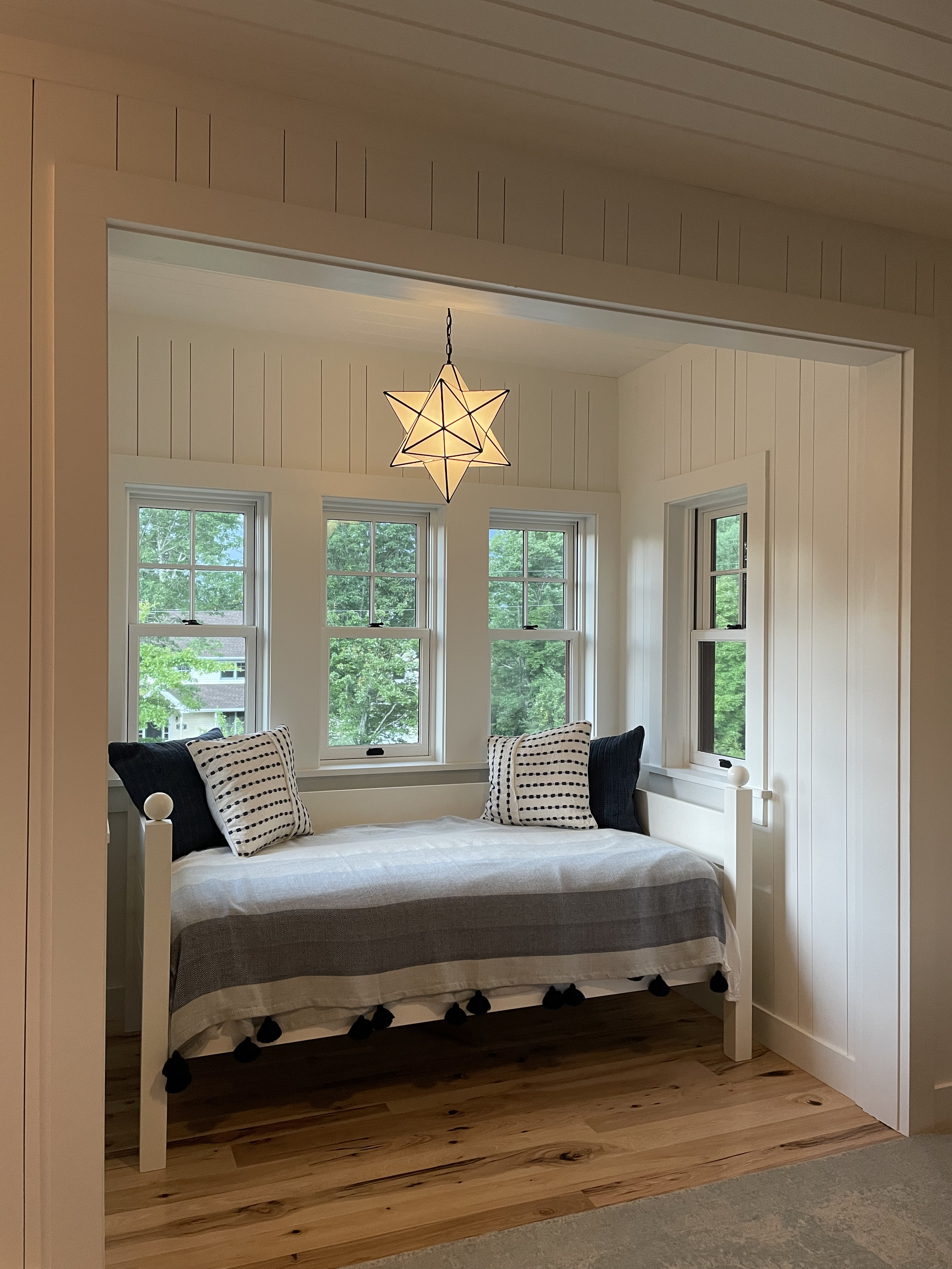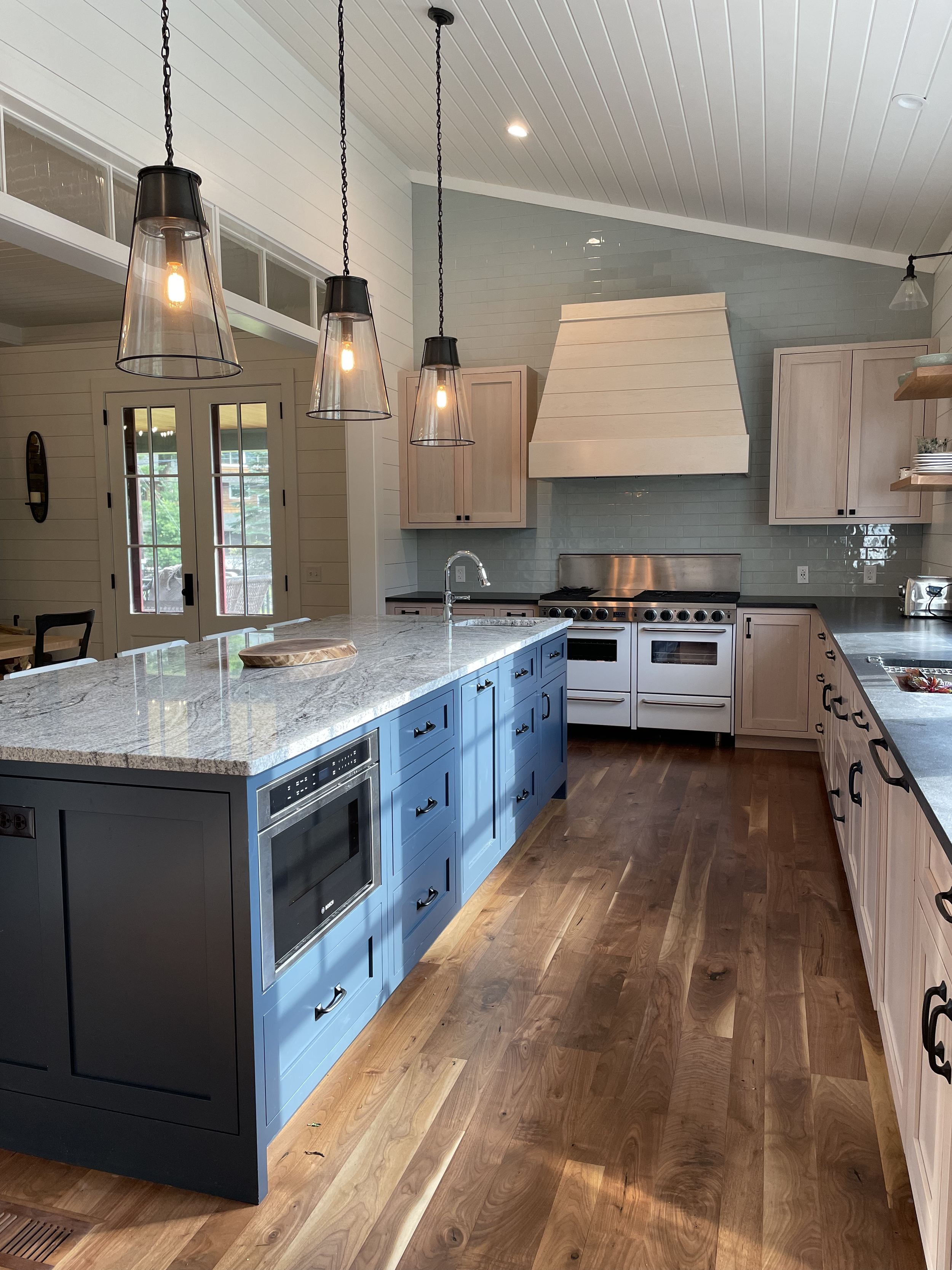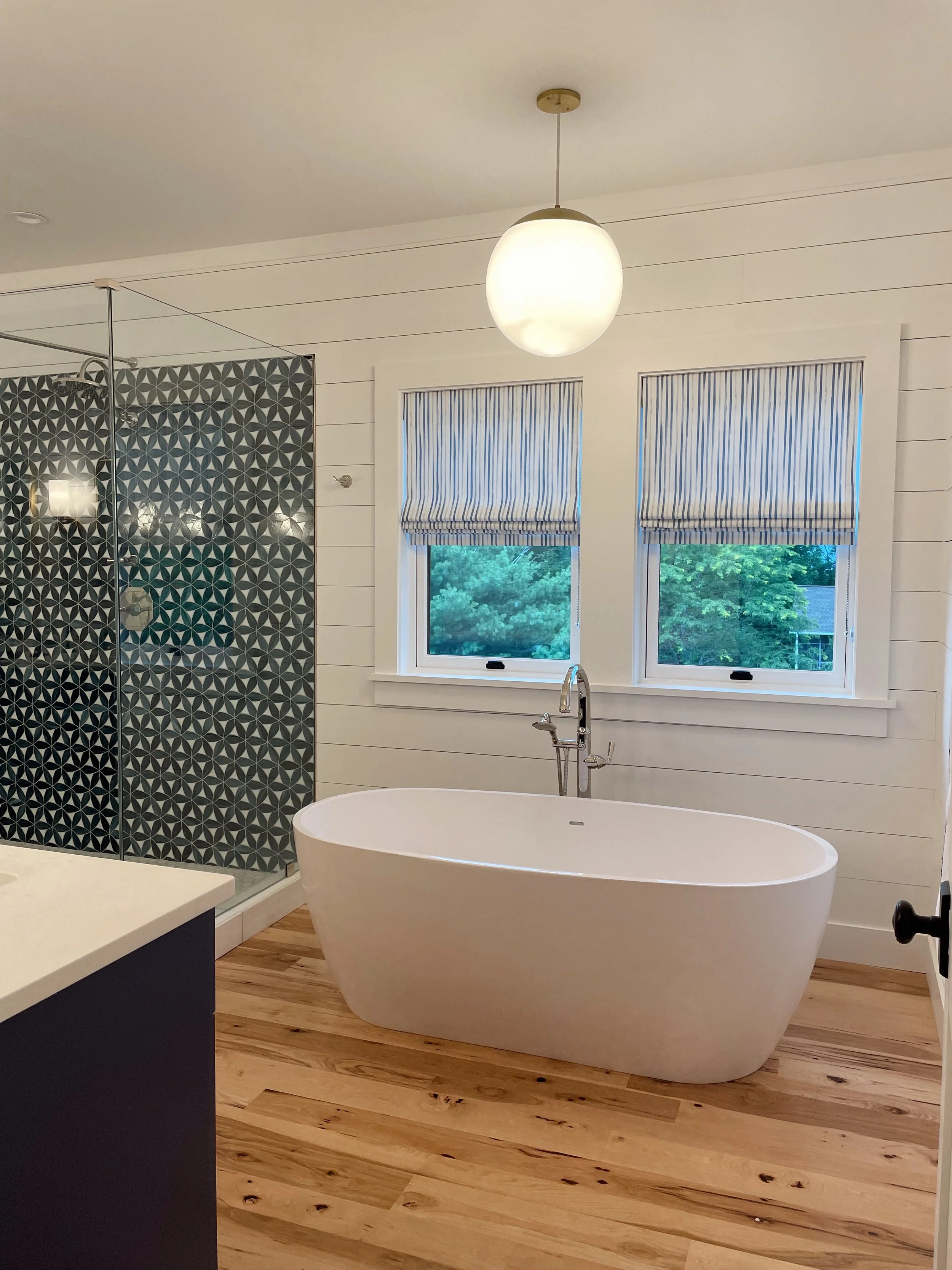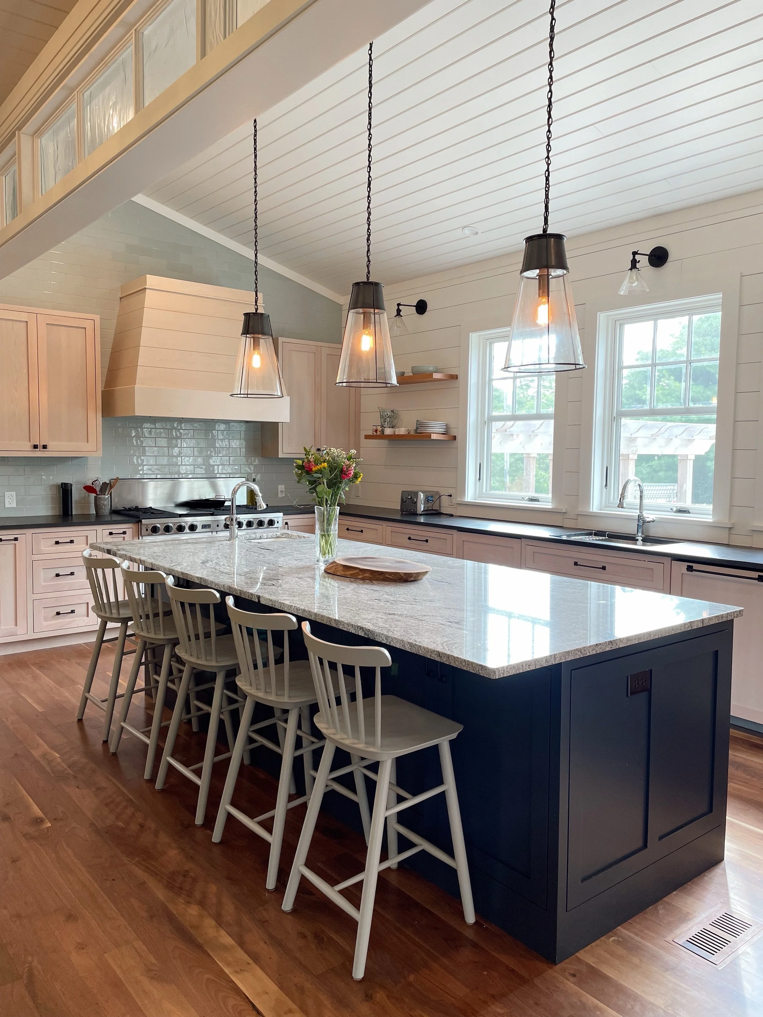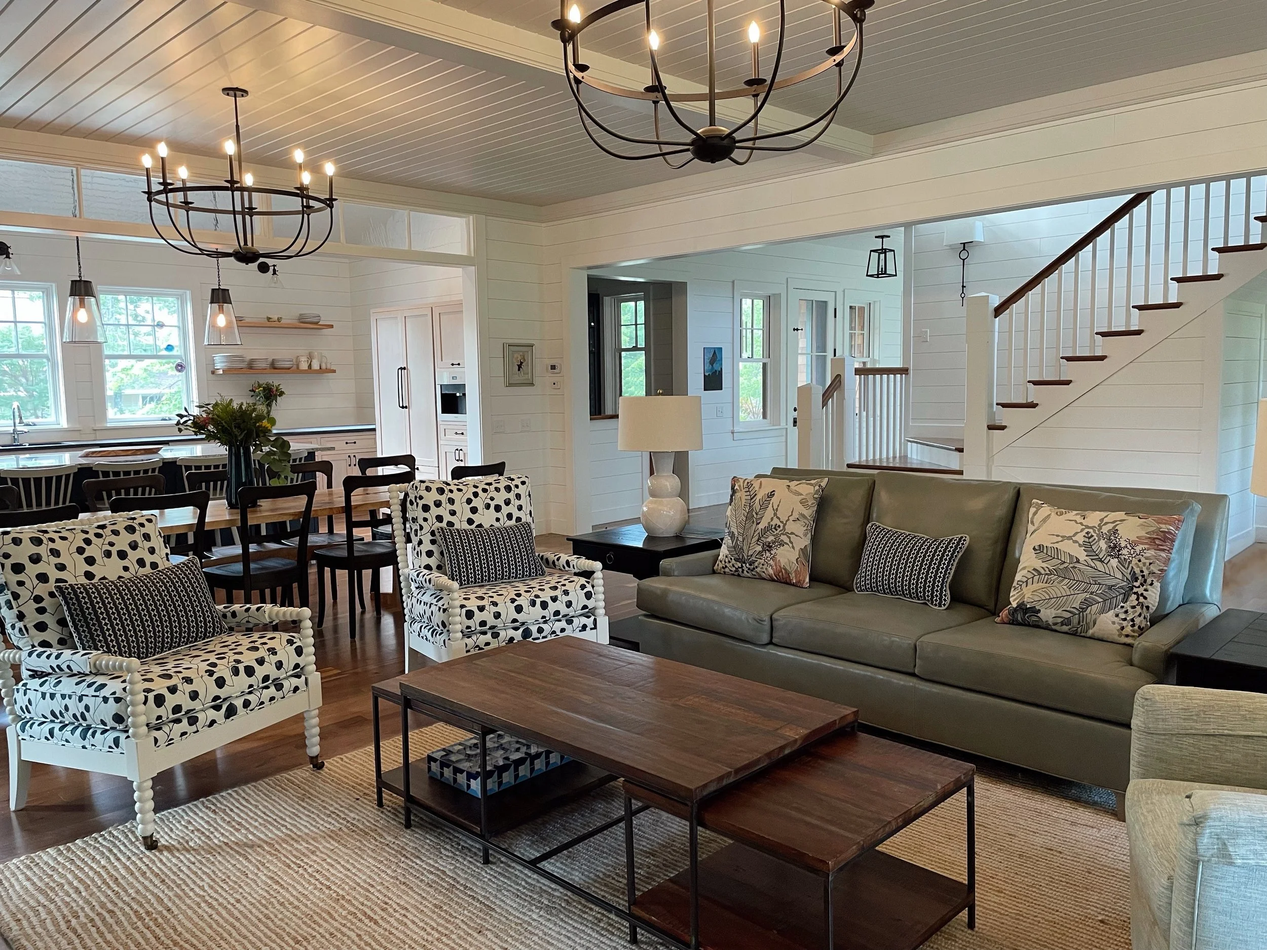 Lake residence with interior materials and finishes, plumbing fixtures, lighting, and furniture selections by Chris Cahill Interior Design.